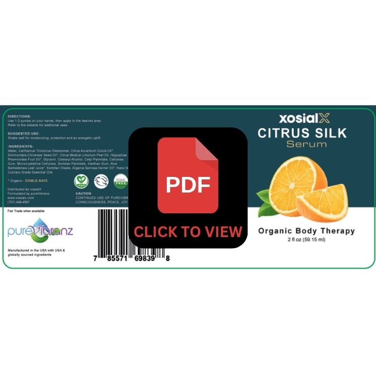 Citrus Silk serum contains Aloe Barbadensis Leaf Juice*, ZeroPoint Water 1000(ionized), Carthamus Tintorious (Safflower), Oleosomes, A Sirius Nano Silver, Citrus Aurantium Dulcis (Blood Orange) Oil, Simmondsia Chinensis (Jojoba) Seed Oil, Citrus Limonum (Lemon) Oil, Hippophae Rhamnoides (Sea Buckthorn) Fruit Oil, Glycerin, Microcrystaline Cellulose, Xanthan Gum, Cetearyl Alcohol, Cetyl Palmitate, Sorbitan Palmitate, Sorbitan Oleate, Argania Spinosa, (Argan) Kernel Oil*, Dehydroacetic Acid, Tocopherol. Certified Toxic Free Foundation and Cruelty Free and Non- GMO.